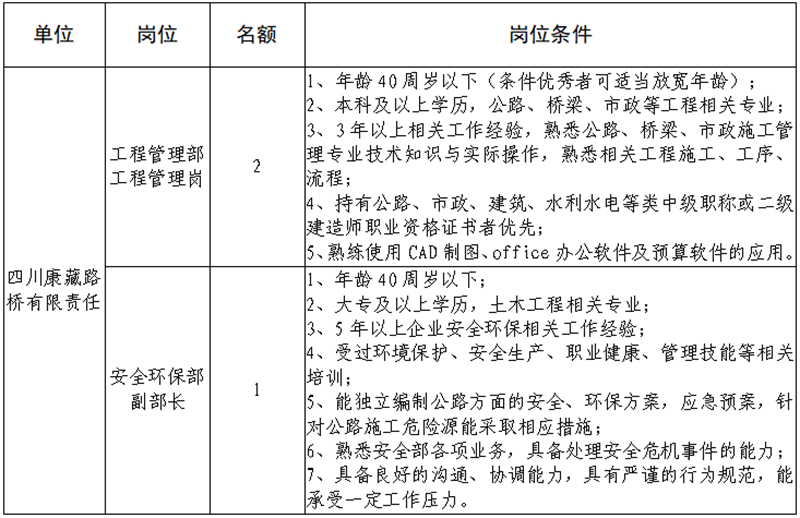 根據(jù)發(fā)展需要,決定面向社會公開招聘雅安市交通建設(shè)(集團)有限責(zé)任公司(以下簡稱“雅安交建集團”)所屬子公司相關(guān)人員3名,現(xiàn)將有關(guān)事項公告如下: