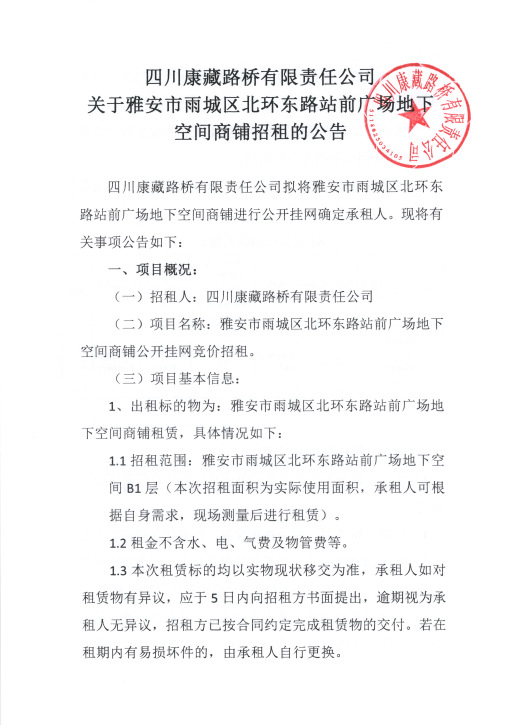 四川康藏路橋有限責(zé)任公司關(guān)于雅安市雨城區(qū)北環(huán)東路站前廣場(chǎng)地下空間商鋪招租的公告