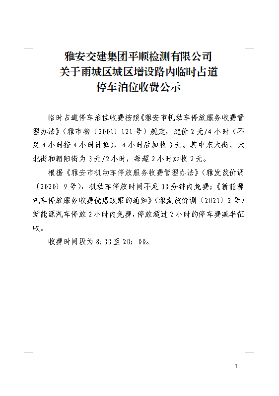 雅安交建集團(tuán)平順檢測有限公司 關(guān)于雨城區(qū)城區(qū)增設(shè)路內(nèi)臨時(shí)占道 停車泊位收費(fèi)公示附件
