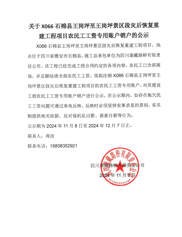 關(guān)于X066石棉縣王崗坪至王崗坪景區(qū)段災后恢復重建工程項目農(nóng)民工工資專用賬戶銷戶的公示