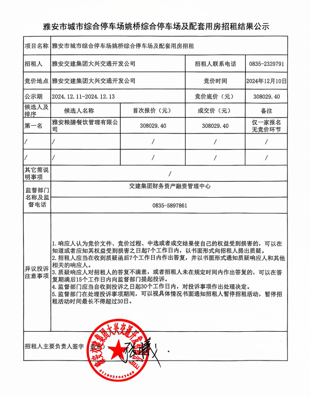 雅安市城市綜合停車場姚橋綜合停車場及配套用房招租結(jié)果公示
