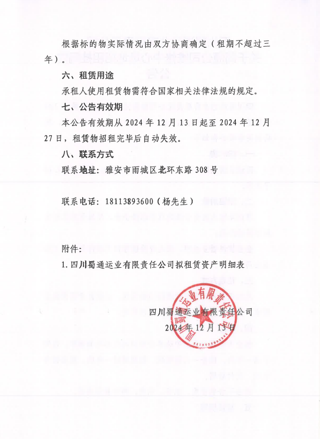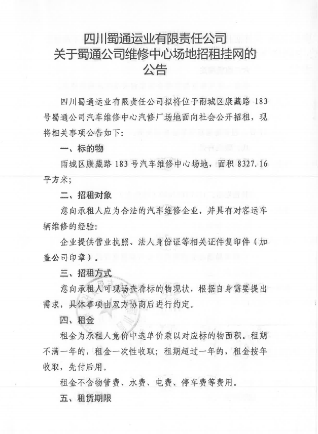 四川蜀通運(yùn)業(yè)有限責(zé)任公司 關(guān)于蜀通公司維修中心場(chǎng)地招租掛網(wǎng)的 公告