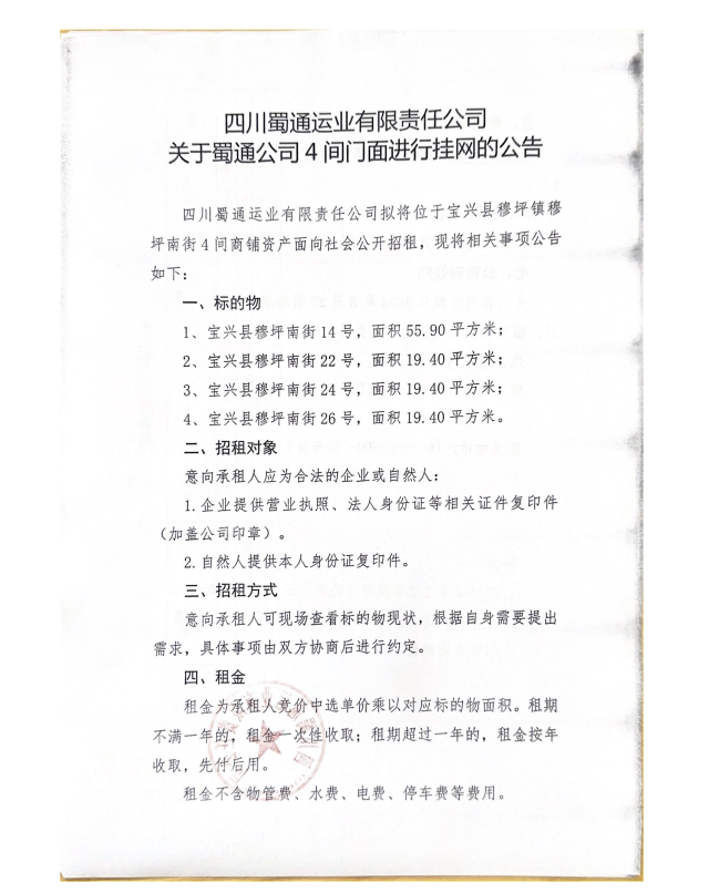 四川蜀通運業(yè)有限責(zé)任公司關(guān)于蜀通公司4間門面進行掛網(wǎng)的公告