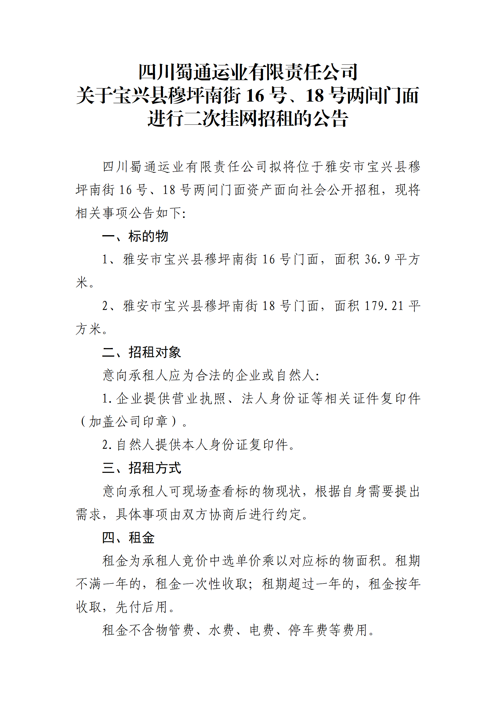 四川蜀通運(yùn)業(yè)有限責(zé)任公司 關(guān)于寶興縣穆坪南街16號(hào)、18號(hào)兩間門面進(jìn)行二次掛網(wǎng)招租的公告