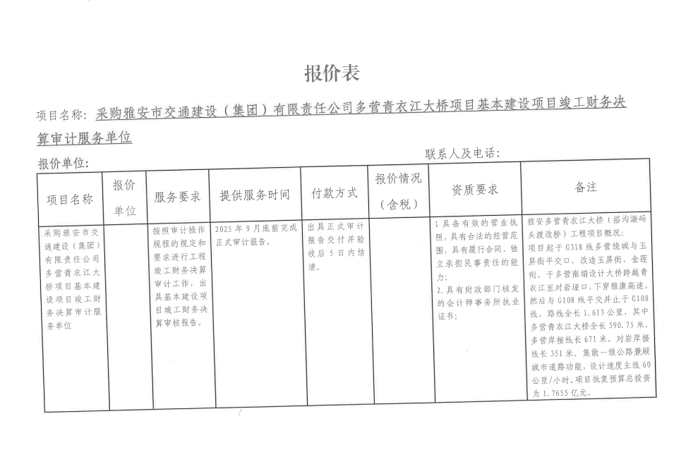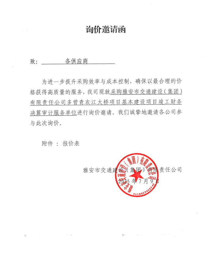 詢價(jià)邀請(qǐng)函——采購雅安市交通建設(shè)(集團(tuán))有限責(zé)任公司多營青衣江大橋項(xiàng)目基本建設(shè)項(xiàng)目竣工財(cái)務(wù)決算審計(jì)服務(wù)單位