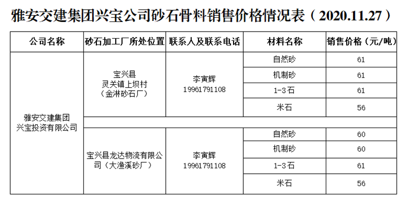 ÑŰ²½»½¨¼¯ˆFÅdŒš¹«Ë¾É°Ê¯¹ÇÁÏäNÊÛƒr¸ñÇé›r±í£¨2020.11.27£©