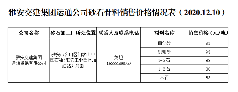ÑŰ²½»½¨¼¯ˆFß\ͨ¹«Ë¾É°Ê¯¹ÇÁÏäNÊÛƒr¸ñÇé›r±í£¨2020.12.10£©