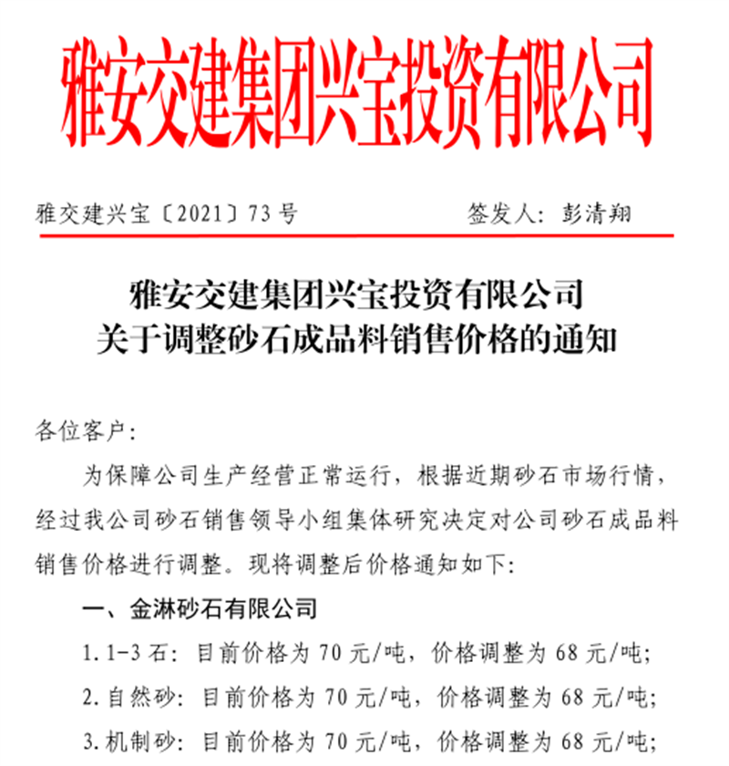 雅安交建集團(tuán)云石公司關(guān)于調(diào)整成品料銷售價(jià)格的通知(2021.11.4)