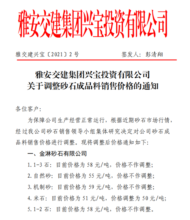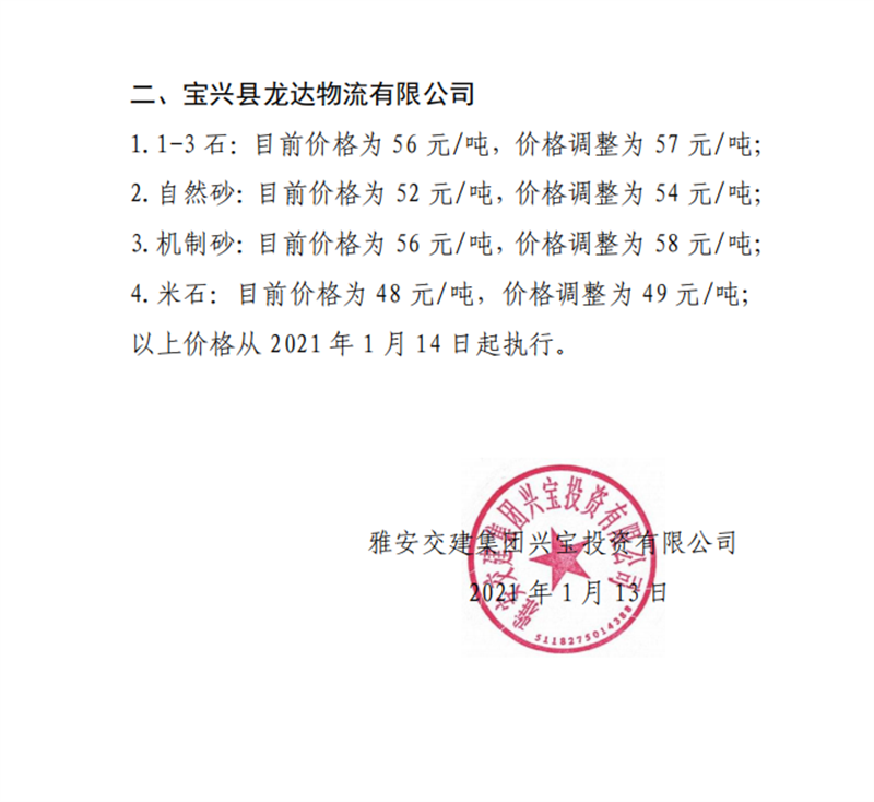雅安交建集團(tuán)興寶公司砂石骨料銷售價(jià)格情況表(2021.1.14)