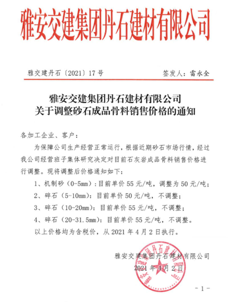 雅安市交建集團丹石公司石灰?guī)r成品骨料掛牌價(2021.4.2)