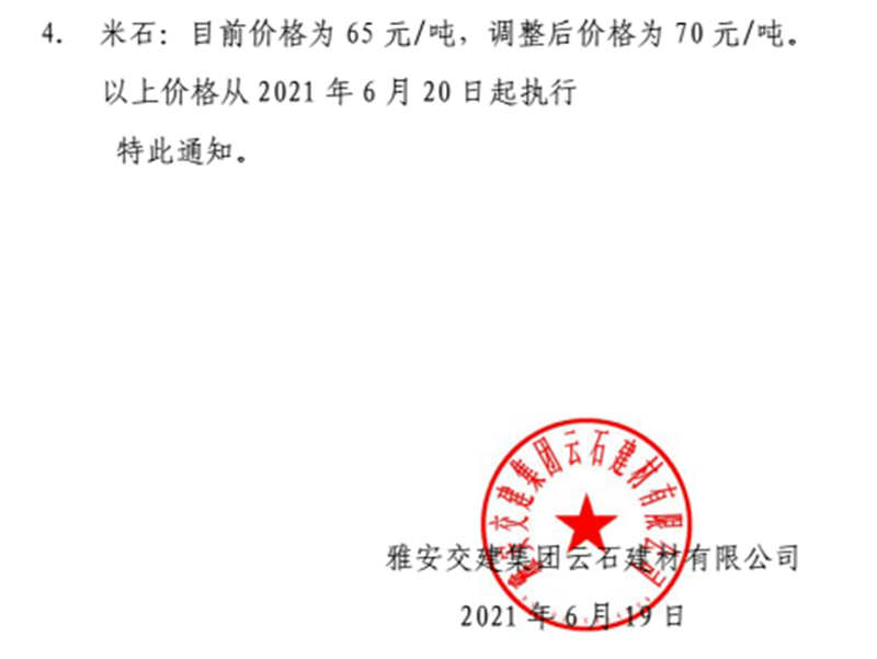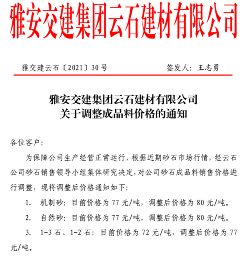 雅安交建集團云石公司砂石骨料銷售價格情況表(2021.6.20)