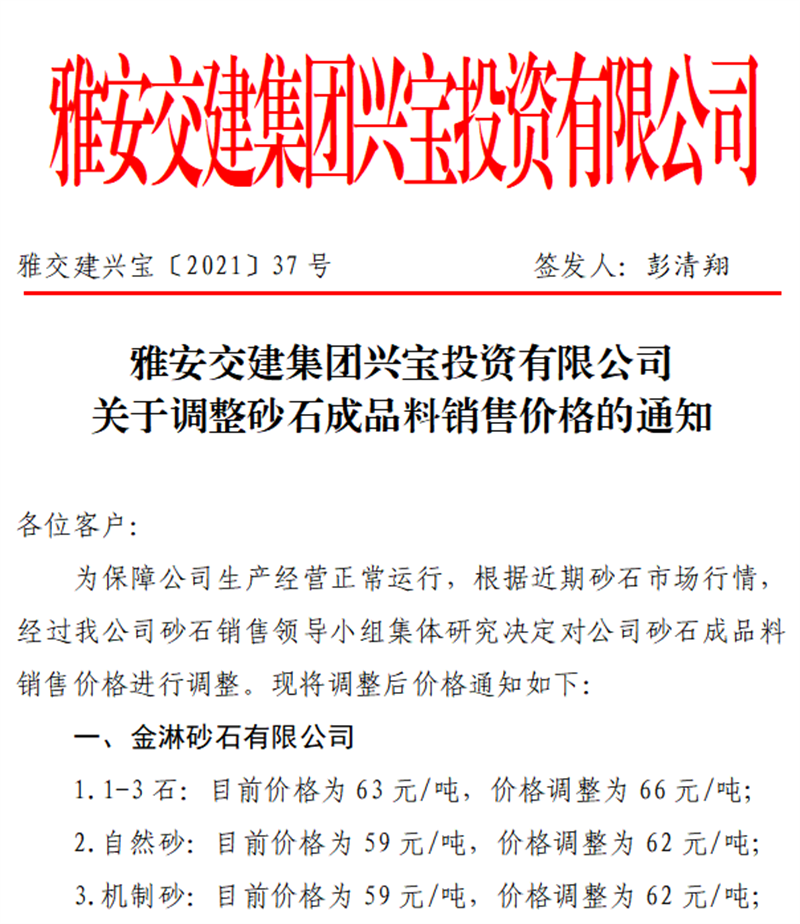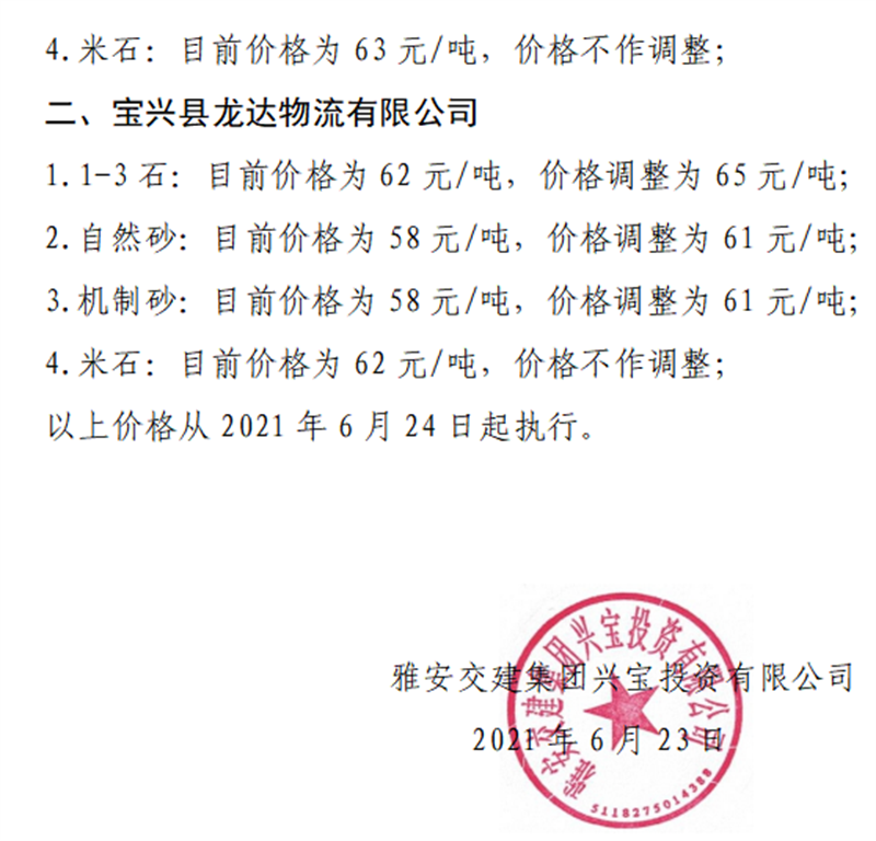 雅安交建集團(tuán)興寶公司砂石骨料銷售價格情況表(2021.6.23)