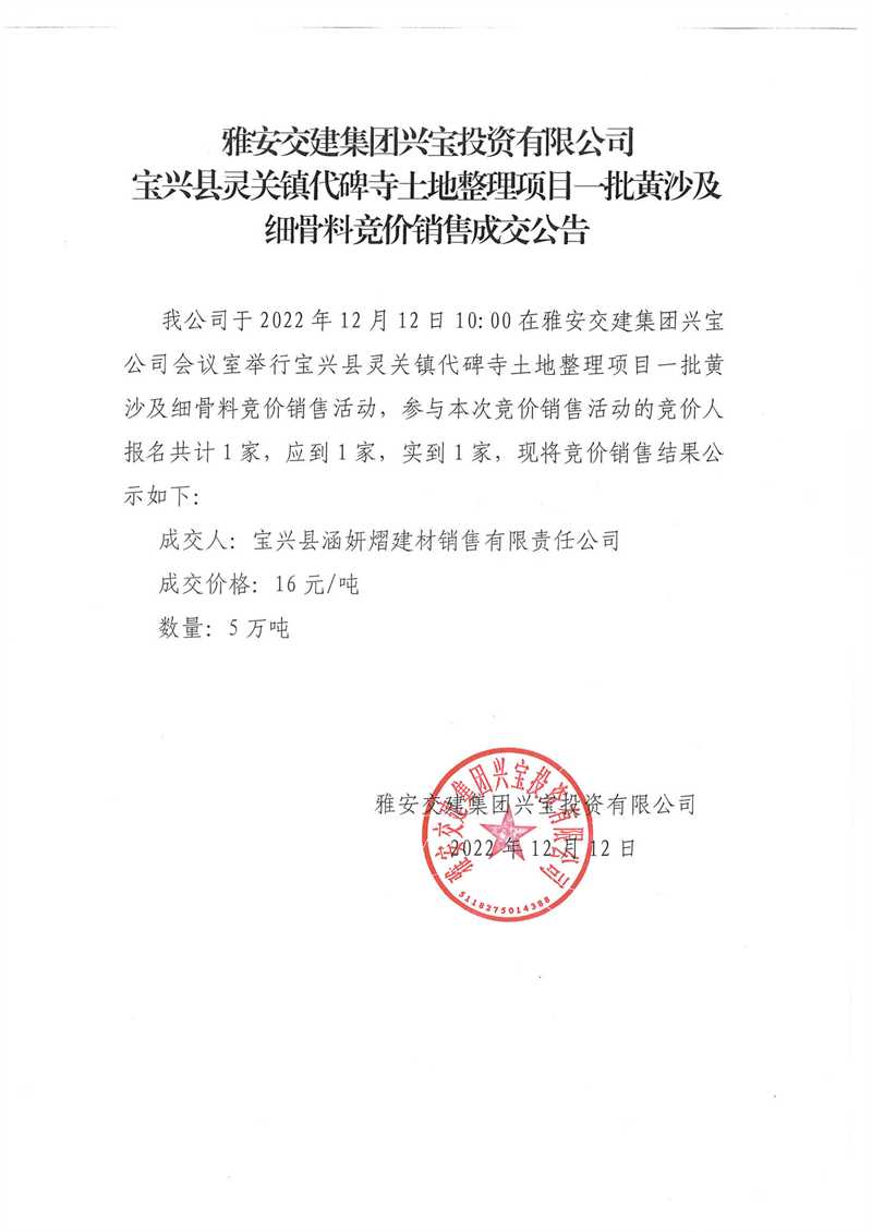 雅安交建集團(tuán)興寶投資有限公司寶興縣靈關(guān)鎮(zhèn)代碑寺土地整理項(xiàng)目5萬(wàn)噸黃沙及細(xì)骨料競(jìng)價(jià)銷(xiāo)售成交公告(2022-12-12)