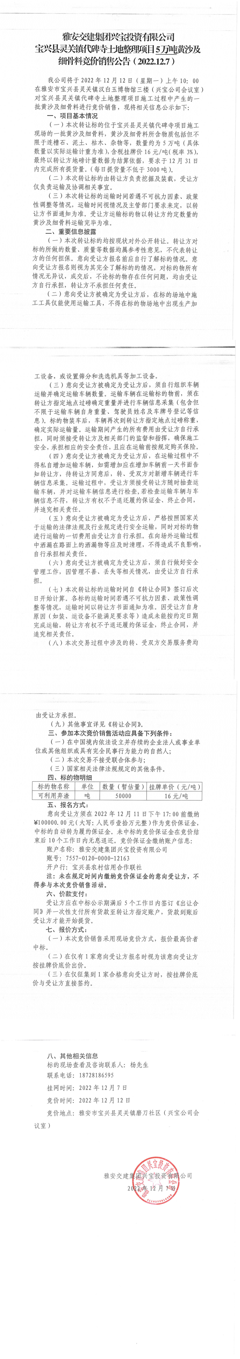 雅安交建集團(tuán)興寶投資有限公司寶興縣靈關(guān)鎮(zhèn)代碑寺土地整理項(xiàng)目5萬(wàn)噸黃沙及細(xì)骨料競(jìng)價(jià)銷售成交公告(2022-12-12)