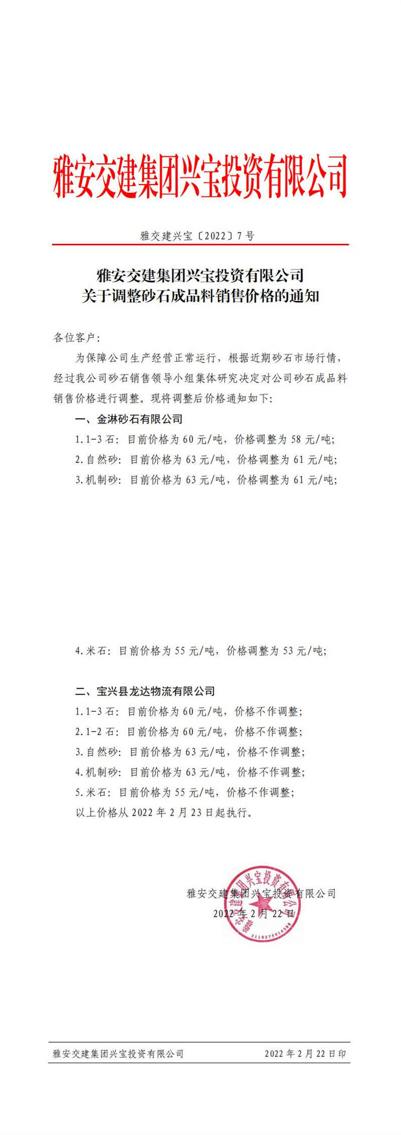雅安交建集團(tuán)興寶投資有限公司 關(guān)于調(diào)整砂石成品料銷售價格的通知(2022-2-23)