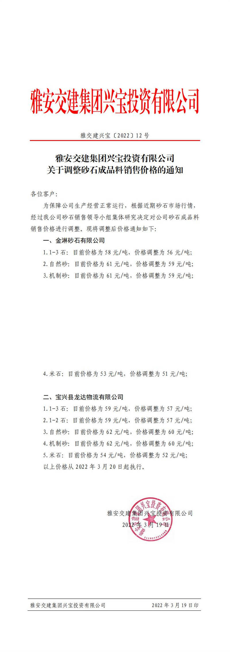 ÑŰ²½»½¨ÅdŒš¹«Ë¾êP(gu¨¡n)ÓÚÕ{(di¨¤o)Õûɰʯ³ÉÆ·ÁÏäNÊÛƒr(ji¨¤)¸ñµÄ֪ͨ£¨2022-3-1£©