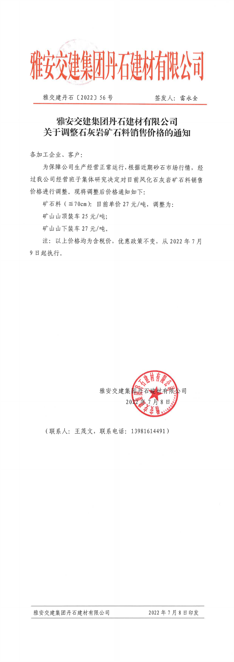 雅交建丹石關(guān)于調(diào)整石灰?guī)r礦石料銷售價格的通知(2022-7-8)