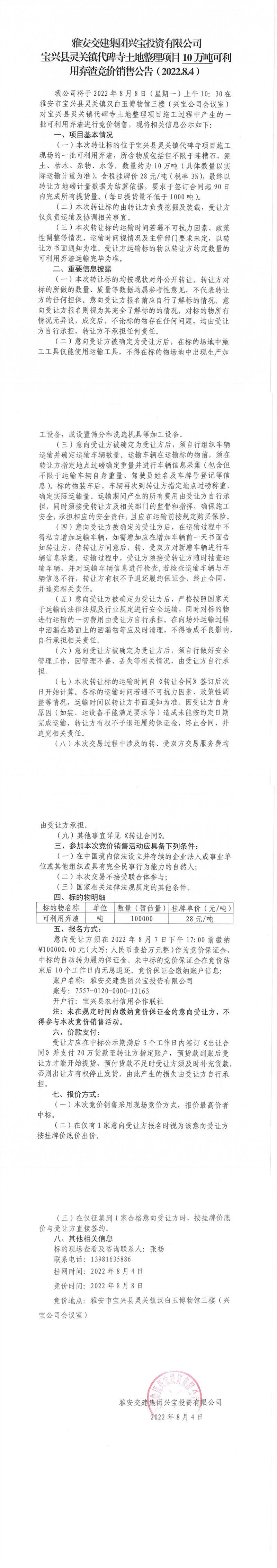 雅安交建集團(tuán)興寶投資有限公司靈關(guān)鎮(zhèn)代碑寺土地整理項(xiàng)目10萬噸可利用棄渣競價(jià)銷售公告(2022.8.4)