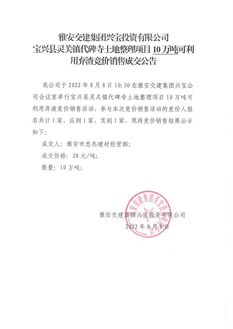 代碑寺土地整理項(xiàng)目100萬噸可利用棄渣競價銷售成交公告