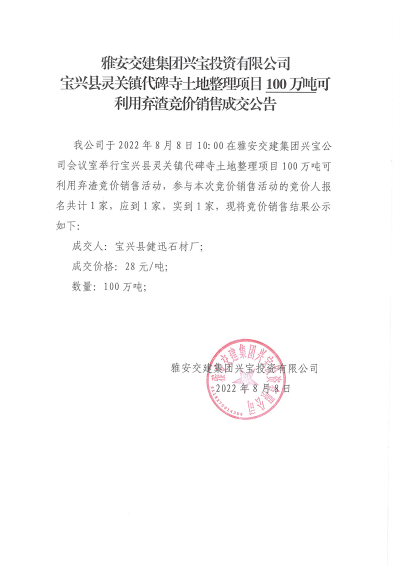 代碑寺土地整理項(xiàng)目10萬噸可利用棄渣競價(jià)銷售成交公告