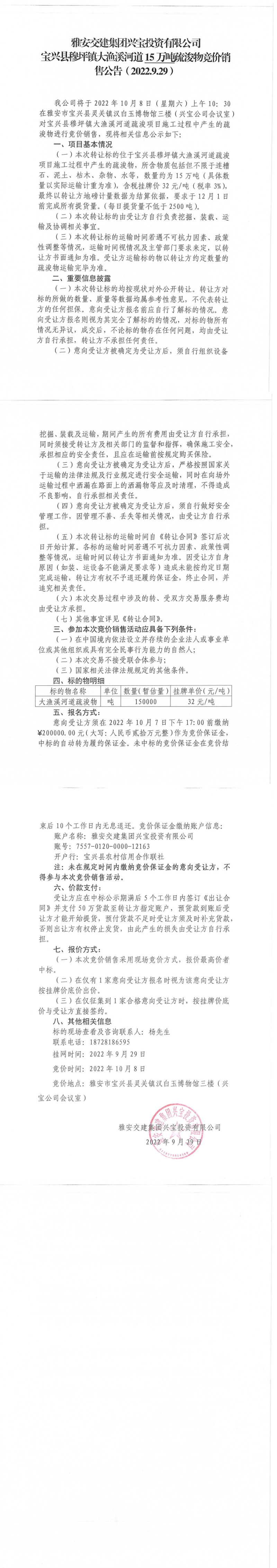 雅安交建集團(tuán)興寶投資有限公司寶興縣穆坪鎮(zhèn)大漁溪河道15萬噸疏浚物競價銷售公告(2022.9.29)