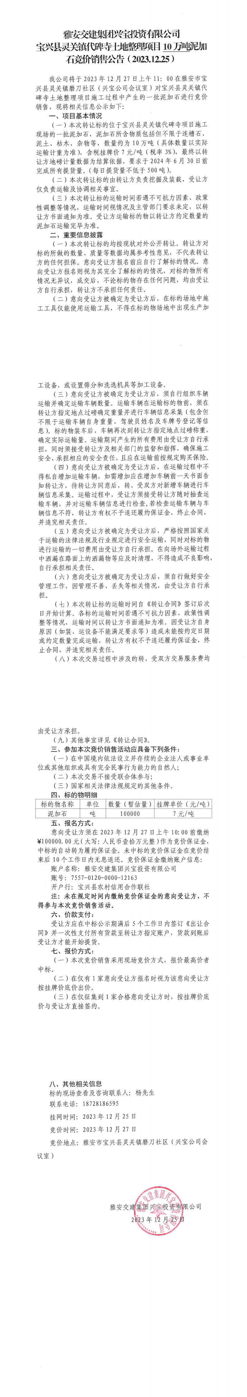 雅安交建集團(tuán)興寶投資有限公司10萬噸泥加石競價(jià)銷售公告(2023.12.25)