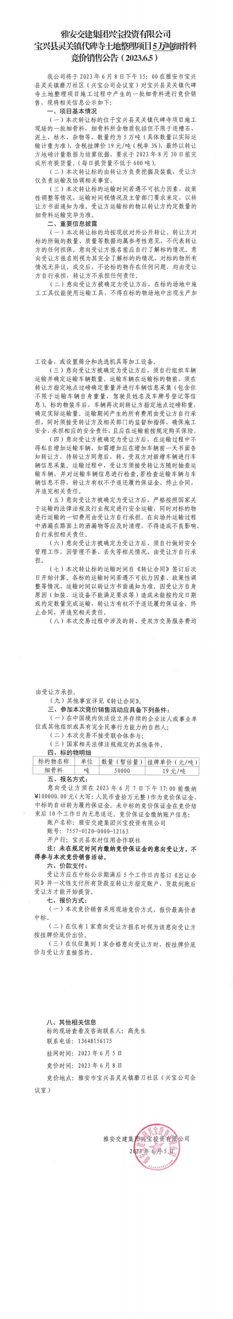 雅安交建集團(tuán)興寶投資有限公司寶興縣靈關(guān)鎮(zhèn)代碑寺土地整理項(xiàng)目5萬(wàn)噸細(xì)骨料競(jìng)價(jià)銷(xiāo)售公告(2023.6.5)
