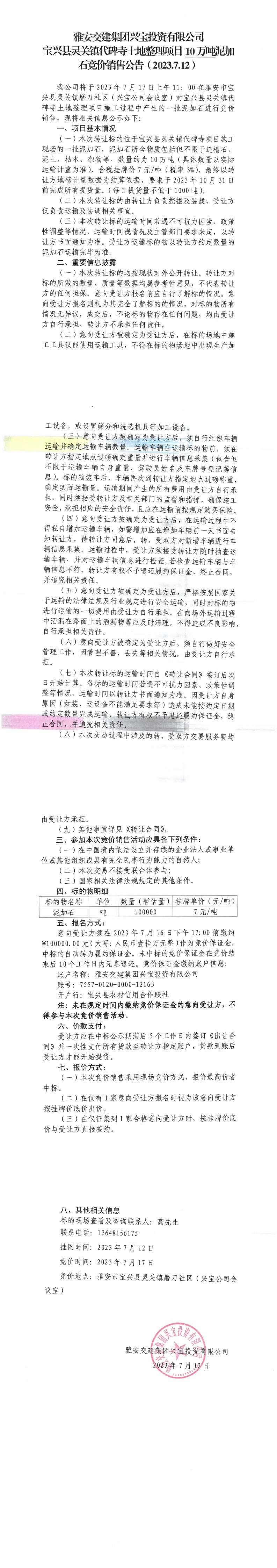 雅安交建集團興寶投資有限公司寶興縣靈關(guān)鎮(zhèn)代碑寺土地整理項目10萬噸泥加石競價銷售公告(2023.7.12)