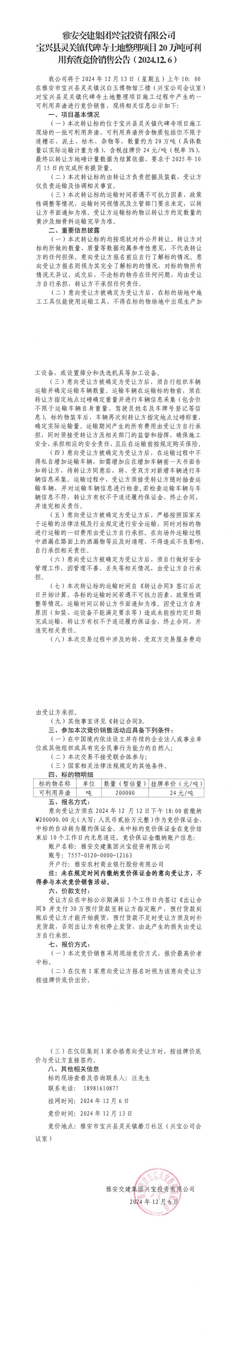 雅安交建集團(tuán)興寶投資有限公司靈關(guān)鎮(zhèn)代碑寺土地整理項(xiàng)目20萬噸可利用棄渣競(jìng)價(jià)銷售公告(2024.12.06)