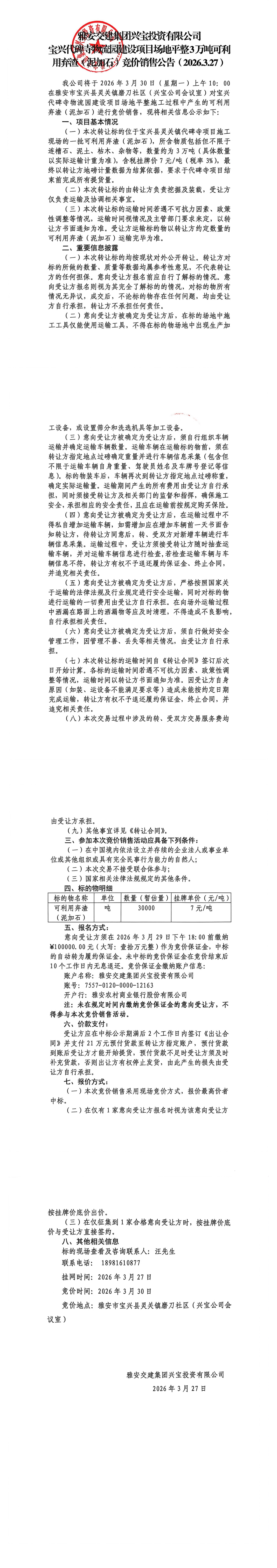 雅安交建集團興寶投資有限公司3萬噸泥加石競價銷售掛網(wǎng)公告(2026.3.27)