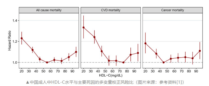 在校正潛在混雜因素后,研究者觀察到HDL-C與全因死亡率、CVD死亡率和癌癥死亡率呈U形相關(guān)。在HDL-C水平為50 mg/dL~79 mg/dL組中,全因和CVD死亡率風(fēng)險(xiǎn)最低。HDL-C水平為40 mg/dL~49 mg/dL組的癌癥死亡率最低。與參考水平50 mg/dL~59 mg/dL相比,HDL-C<30 mg/dL的受試者比極高HDL-C水平(>90 mg/dL)的受試者具有相對(duì)更高的全因死亡風(fēng)險(xiǎn)(HR 1.23,95% CI:1.17~1.29 vs. HR 1.10,95% CI:1.05~1.15)。