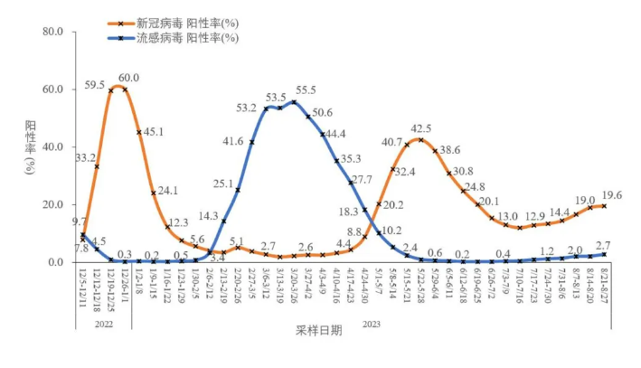 中疾控日前發(fā)布2023年8月全國新型冠狀病毒感染疫情情況顯示,全國哨點(diǎn)醫(yī)院流感樣病例新冠病毒陽性率從第31周(7月31日-8月6日)的14.4%緩慢上升至第34周(8月21日-8月27日)的19.6%。